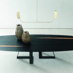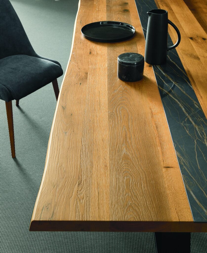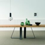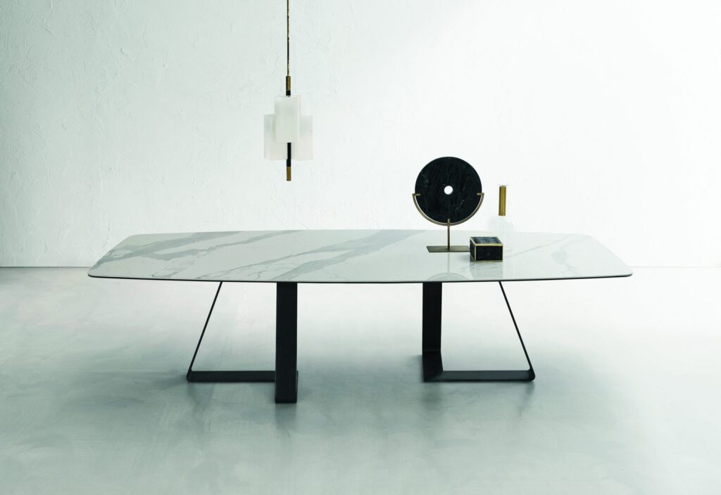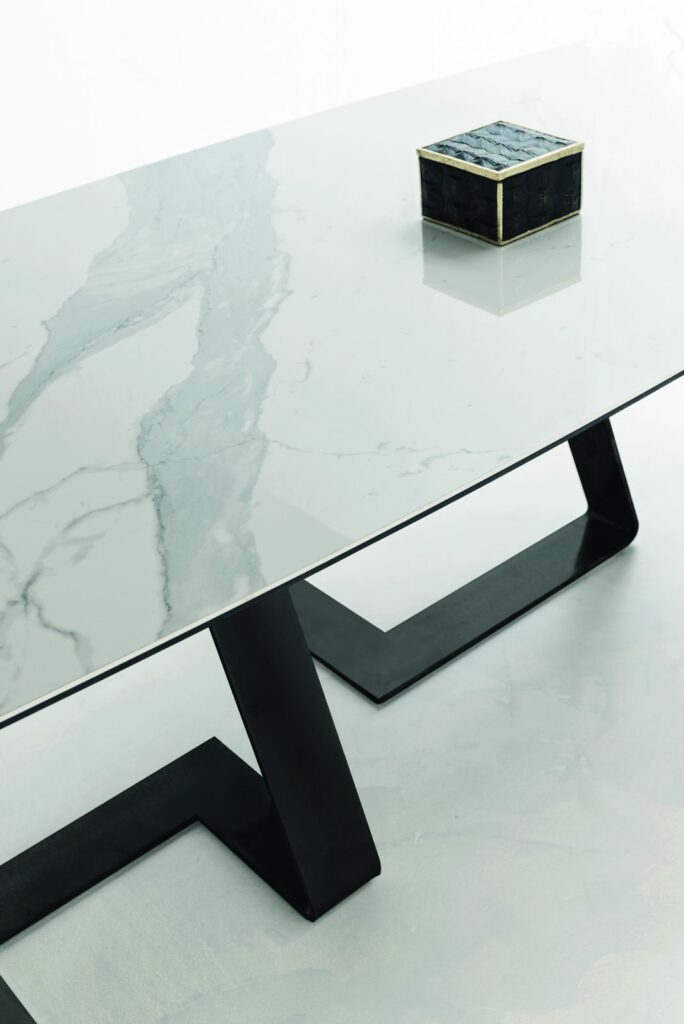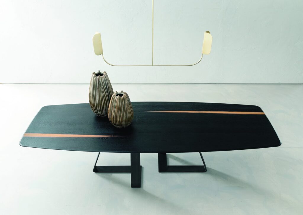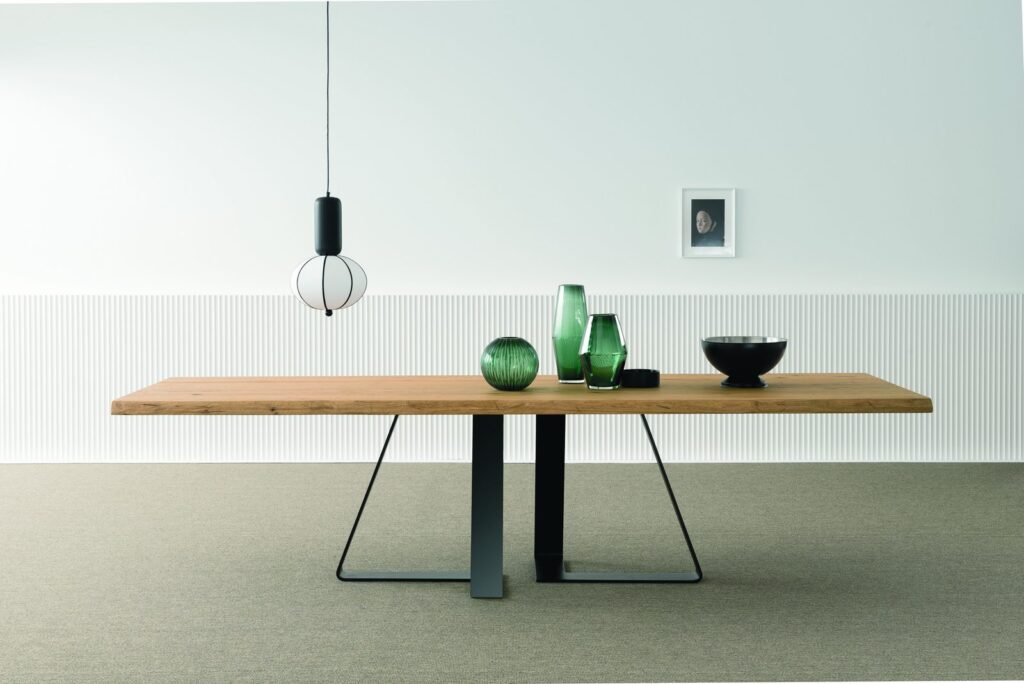 MATERIAL: Steel table base that can be combined with solid European durmast or Canaletto walnut wood tabletops 40/45-mm thick with folder on plywood, solid European durmast wood tabletops 55/60 mm thick, tabletops 64-mm thick with laminboard or plywood support with smooth or plank-effect durmast wood folder on the front, rear, and perimeter, or oval tops 36-mm thick layer of ceramic glued onto a 30-mm thick, black MDF base. Water based vinyl adhesives or two-component acryl coat.