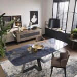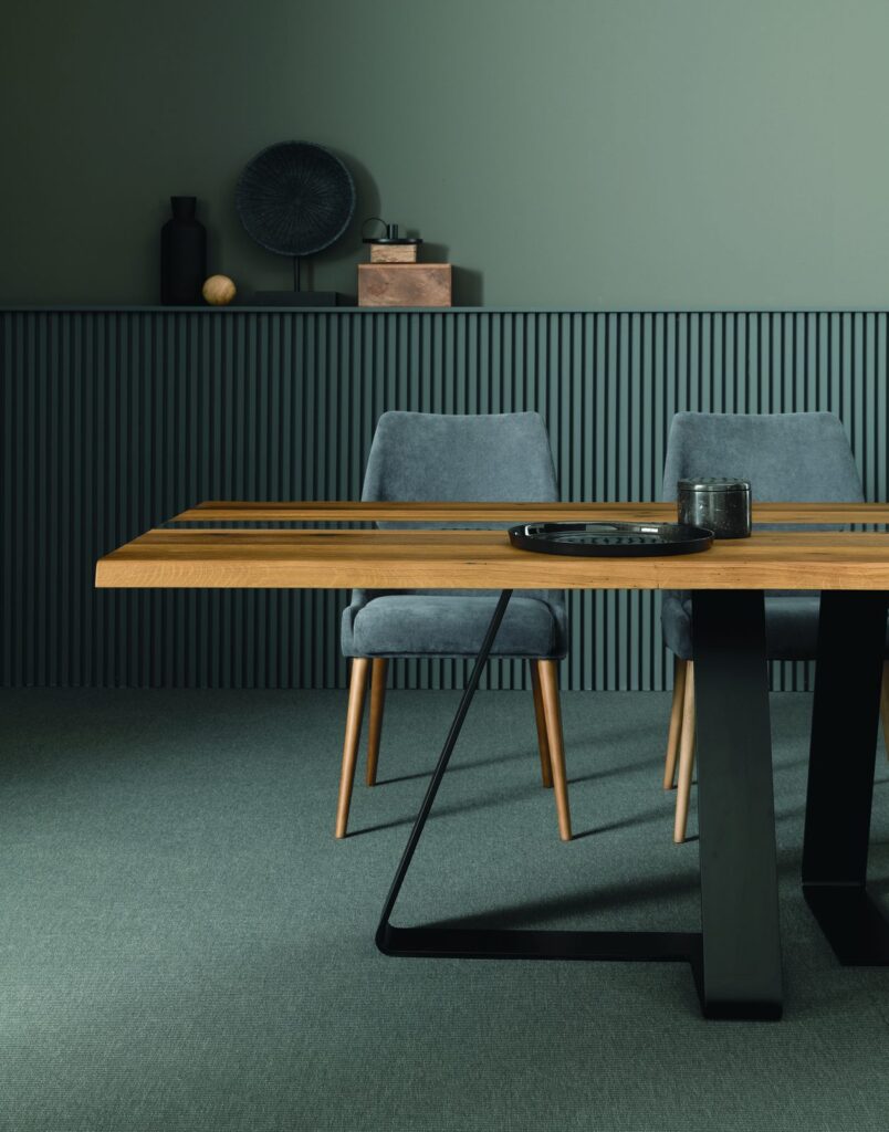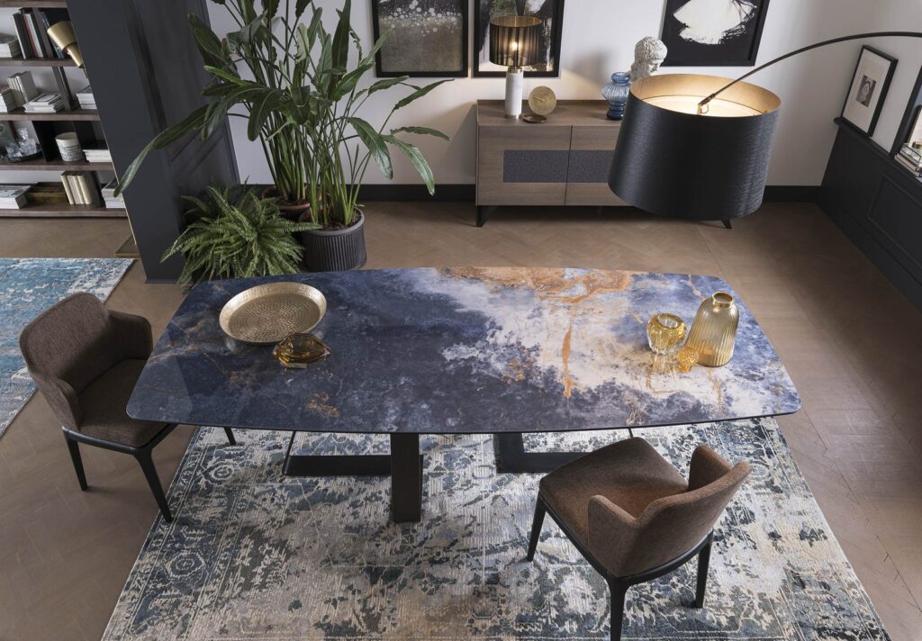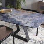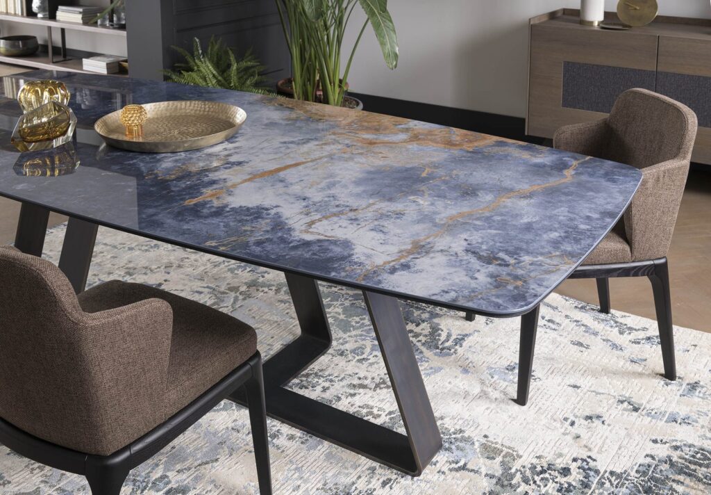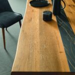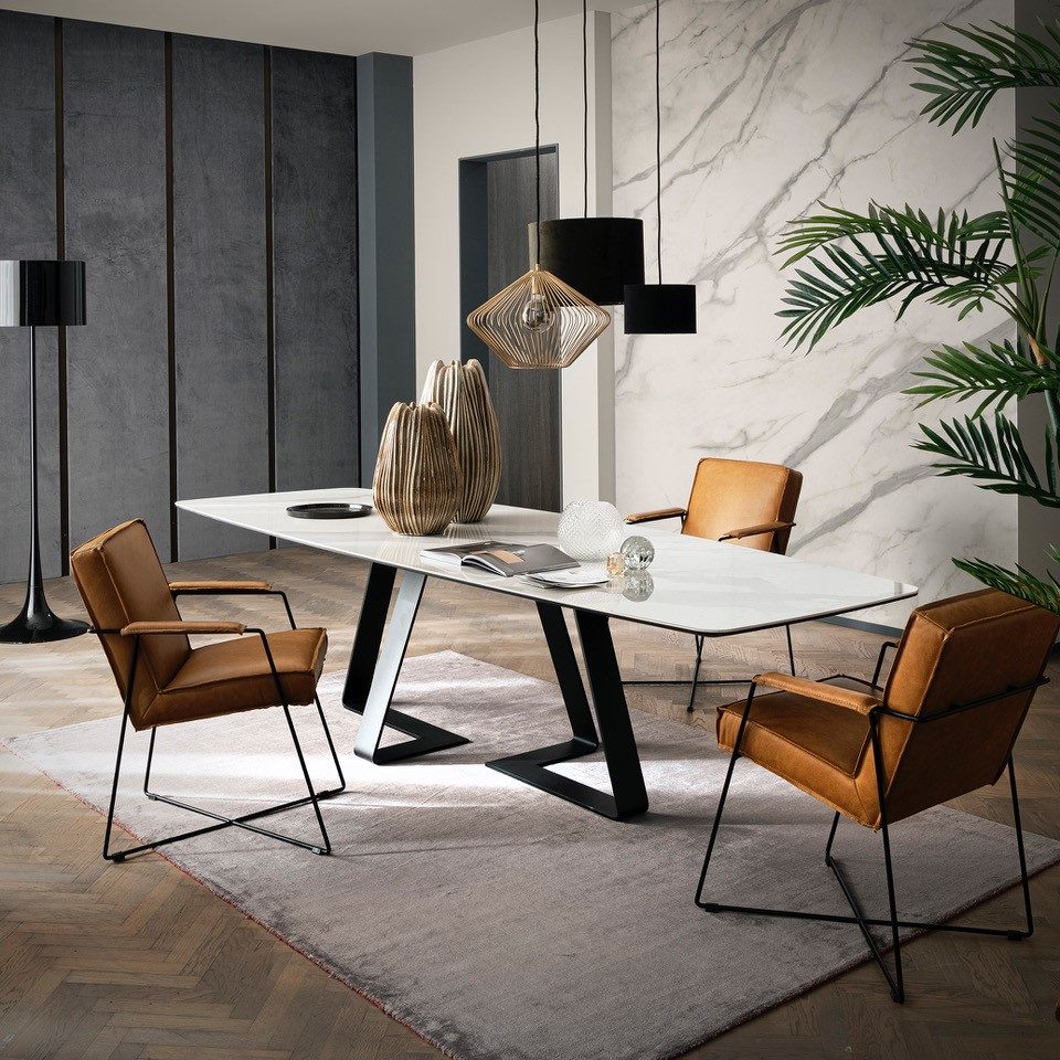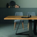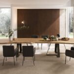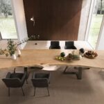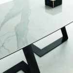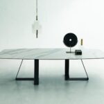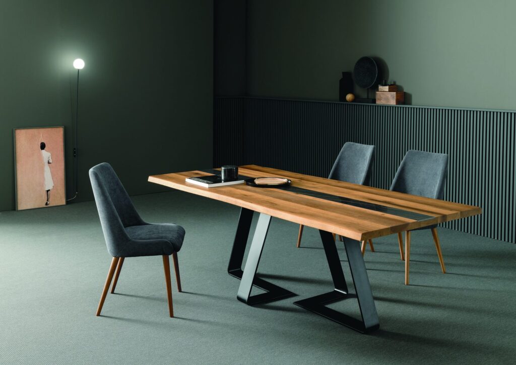 MATERIAL: Steel table base that can be combined with solid European durmast or Canaletto walnut wood tabletops 40/45-mm thick with folder on plywood, solid European durmast wood tabletops 55/60 mm thick, tabletops 64-mm thick with laminboard or plywood support with smooth or plank-effect durmast wood folder on the front, rear, and perimeter, or oval tops 36-mm thick layer of ceramic glued onto a 30-mm thick, black MDF base. Water based vinyl adhesives or two-component acryl coat.