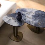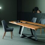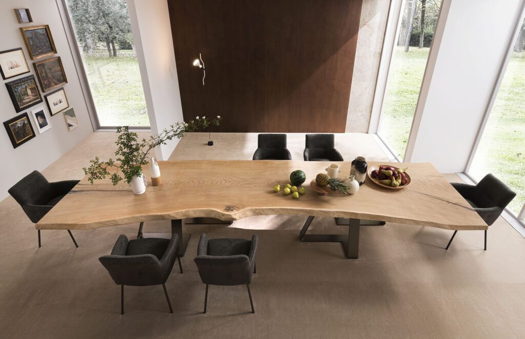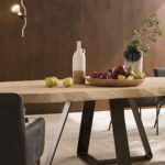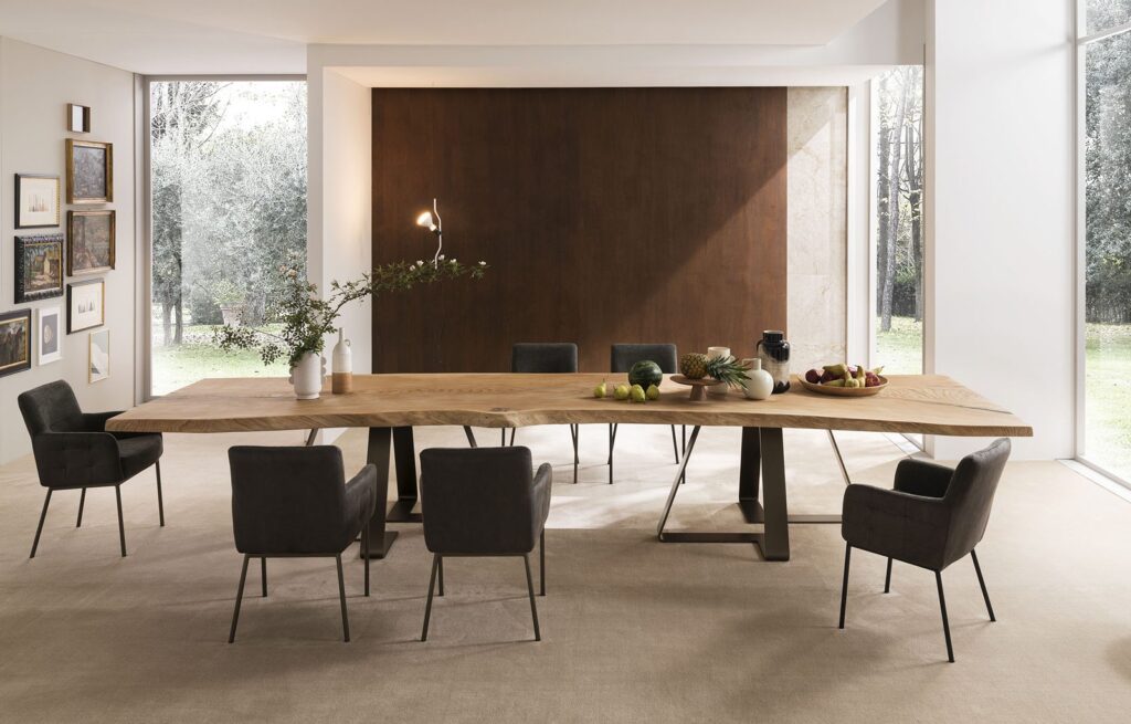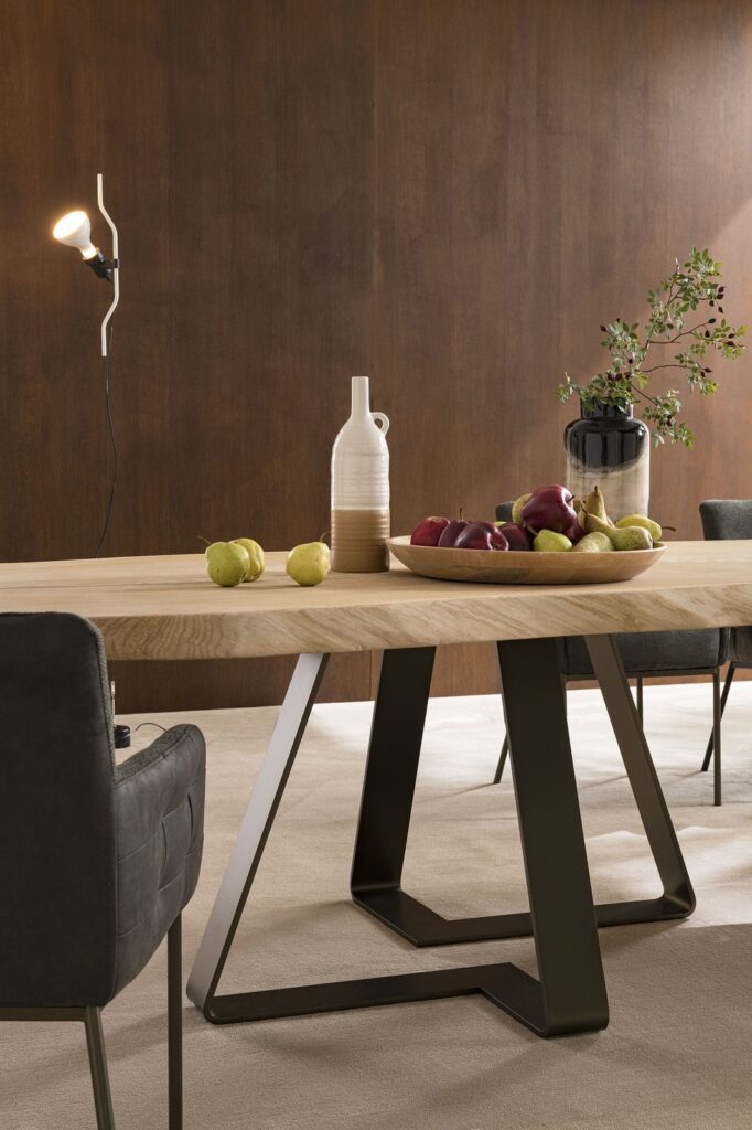 The Double table is the result of the pencil of the Altacorte design office. It appears to be a table with an attractive design, which can increase in value if combined with solid durmast tops of big dimensions. The shape of the forged steel legs creates an eye-catching optical art effect.