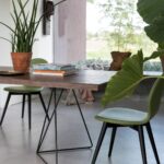 Iron cord base that can be combined with 40 or 60 mm thick tops and straight or irregular edges in solid European turkey oak. Also available in oak with 30 mm thickness, in solid European oak with sloping or irregular edges. Water-based vinyl adhesives, two-component acrylic paints.