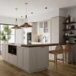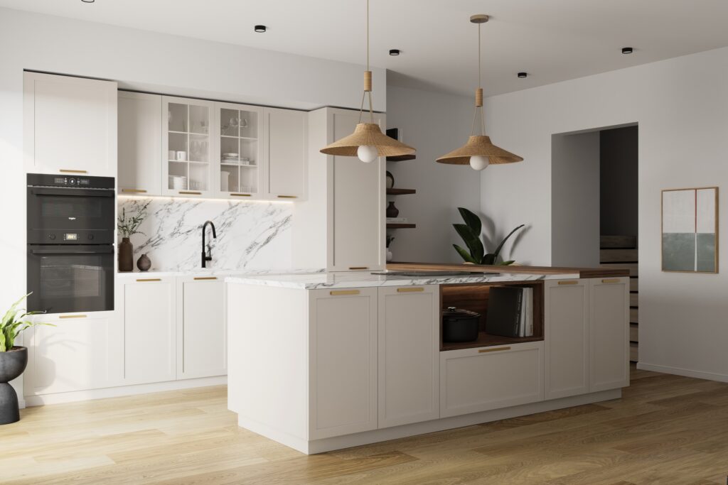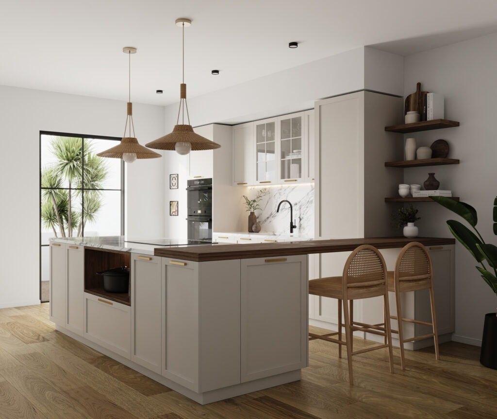Leah is a handcrafted kitchen that blends classic elegance with modern function. Featuring soft matte beige cabinetry, luxurious marble-look ceramic surfaces, and warm wallnut accents, Leah is designed with care and built to last. From the brass hardware to the integrated lighting and premium appliances, every detail is custom-made to suit your style and space.
