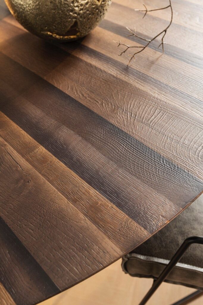 Tops in solid oak, 40 mm thick, brushed surface. Base with powder coated or oxidized steel base with acrylic finish. Legs in shaped solid oak.z