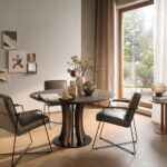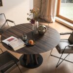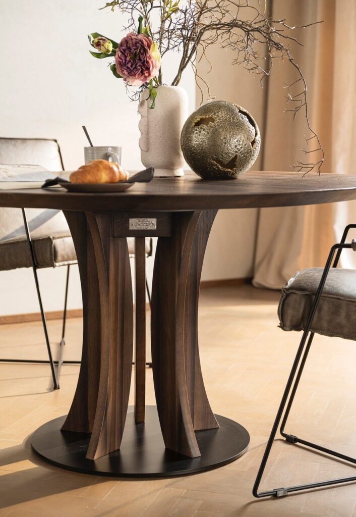 The Luna table is inspired by the phases of the moon through the curvature of the legs. The light passing through the shapes of the wood creates ever-changing plays of shadow. accentuated in the innovative Brunette finish. The use of shaded wood and subsequently ennobled through the expert hands of the polisher creates a unique and unrepeatable effect.