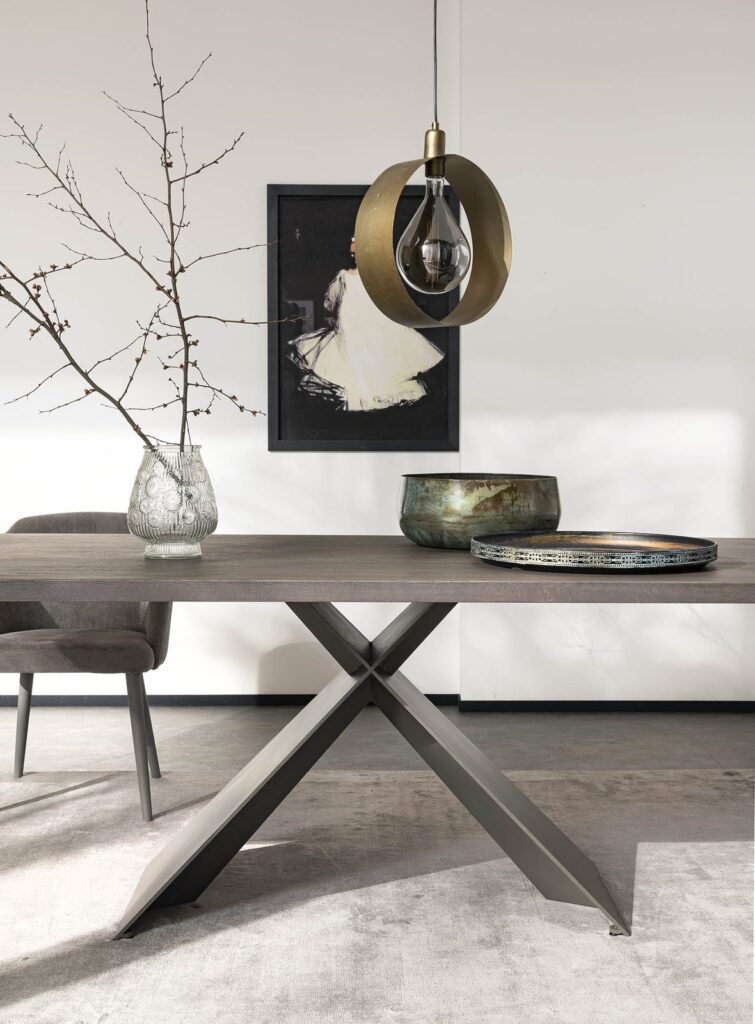 The Xilo table is the result of the pencil of the Altacorte style center. The formal rigidity of the elementary geometries is graced by slight and precious structural interventions inside the base, giving a three-dimensional sensation of the form. The table on display is equipped with an exclusive top with a fossil wood insert of fluvial origin characterized by particular sediments that make it unique in every element thanks to the millenary fossilization of water. Fossil wood extraction operations are carried out manually from the sand and gravel of the riverbeds that have buried and preserved the logs for a period of more than 6,000 years. The oldest trunks are over 8,000 years old and are characterized by very dark color tones. The most relevant peculiarity of fossil wood is the natural uniqueness that characterizes each trunk in terms of intensity of color, design and shades, making each piece different from the other.